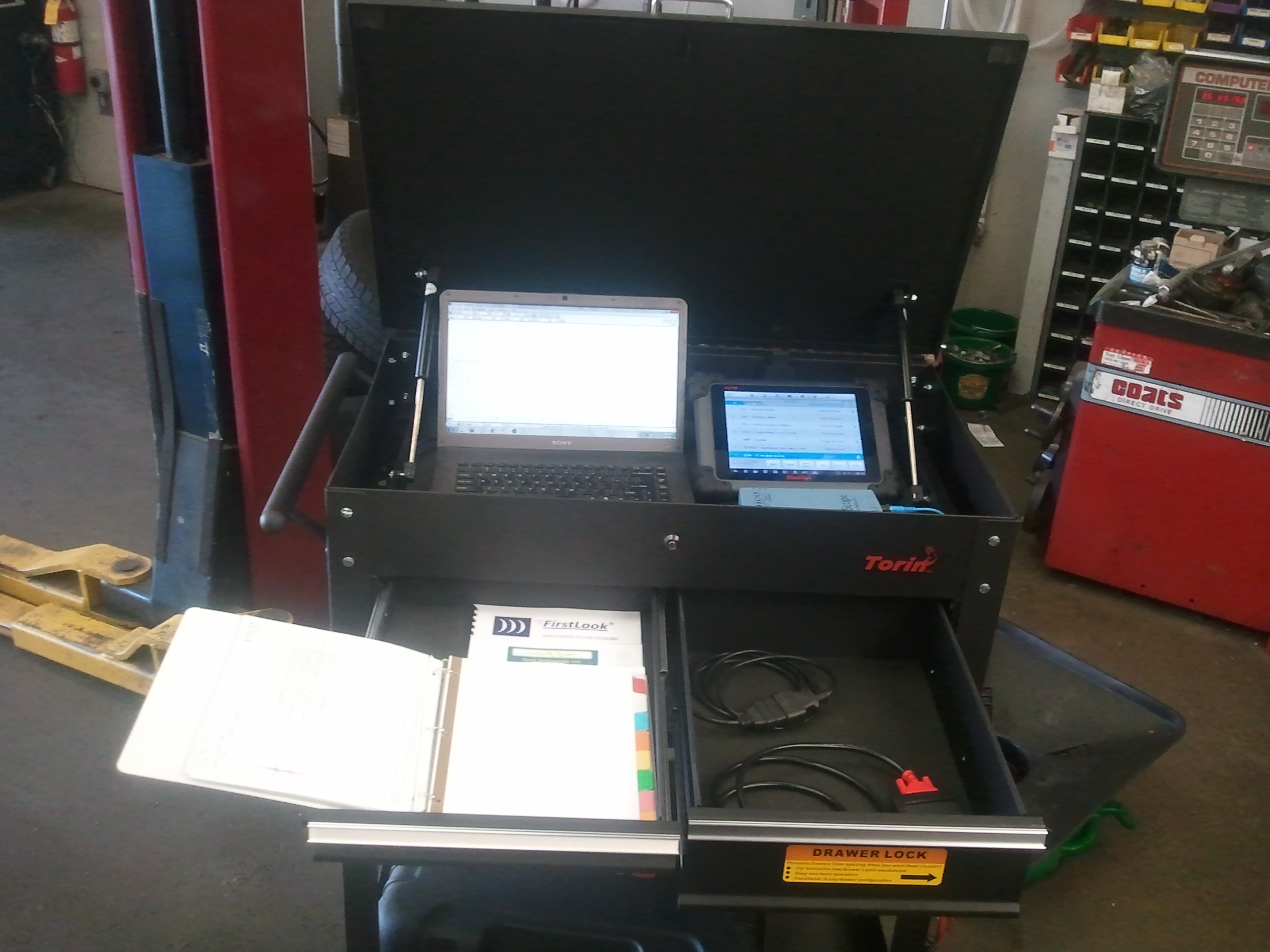 Here's my setup, I just put it together today so I imagine there will be a few revisions in the weeks to come.  The Laptop I've had on my larger Torin tool chest for a while, the Pico I just picked up a few weeks ago and the Autel Maxisys came in last week.  This morning I picked up the tool cart and this week I'm expecting the Cardaq-M to arrive.