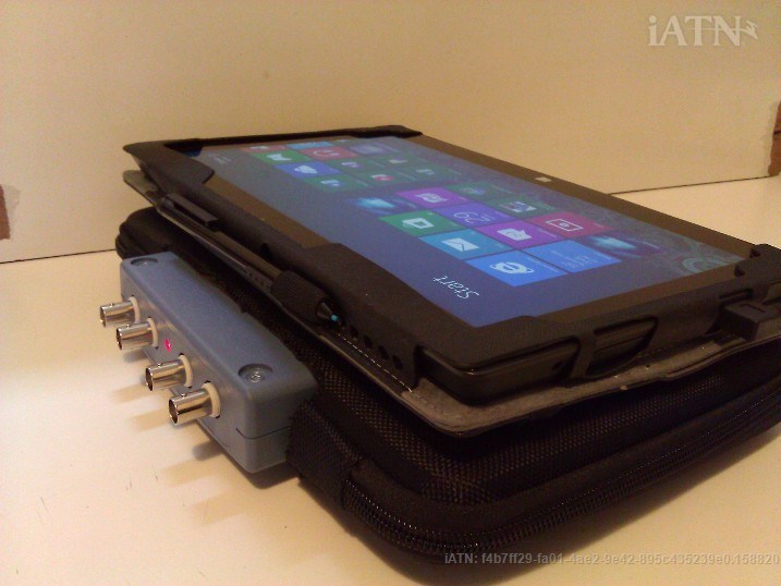 Here is my setup. I bought two different cases designed for a Surface Pro tablet pc. One case I cut a rectangular hole in the end with the hinge, in order for the picoscope to stick through. Then, I got a right angle USB cable so that the install would be more streamlined.